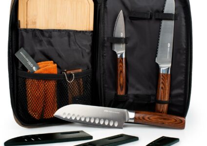 Das Set enthält ein kompaktes Bambus-Schneidebrett mit Saftrinne, ein recyceltes Mikrofaserhandtuch, ein Messerschärfer und einen Satz von drei meisterhaft verarbeiteten Edelstahlmessern mit wasserfesten Holzlaminatgriffen. Entworfen, um für Generationen zu halten. Das Kochmesser hat eine Santoku-Klinge mit Granton-Schliff für anmutig dünne Scheiben. Das Brotmesser mit Wellenschliff schneidet selbst die härteste Baguettekruste mit Laserpräzision, und das Gemüsemesser manövriert geschickt durch knackige…