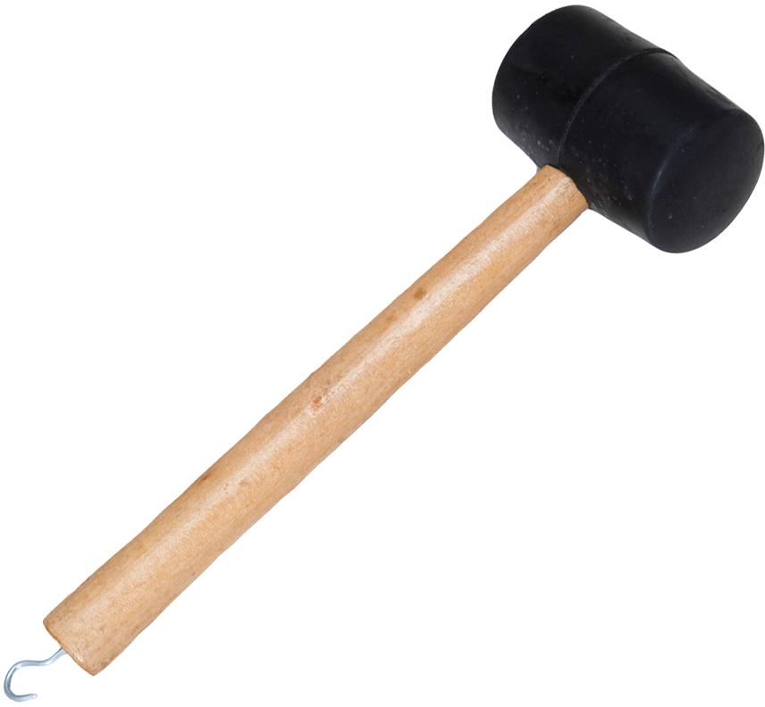 Zelthammer mit starkem Holzgriff und schwerem Hammerkopf aus Vollgummi. Mit Haken zum Heringe ziehen. Gesamtlänge: 24 cm.