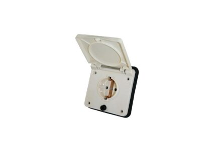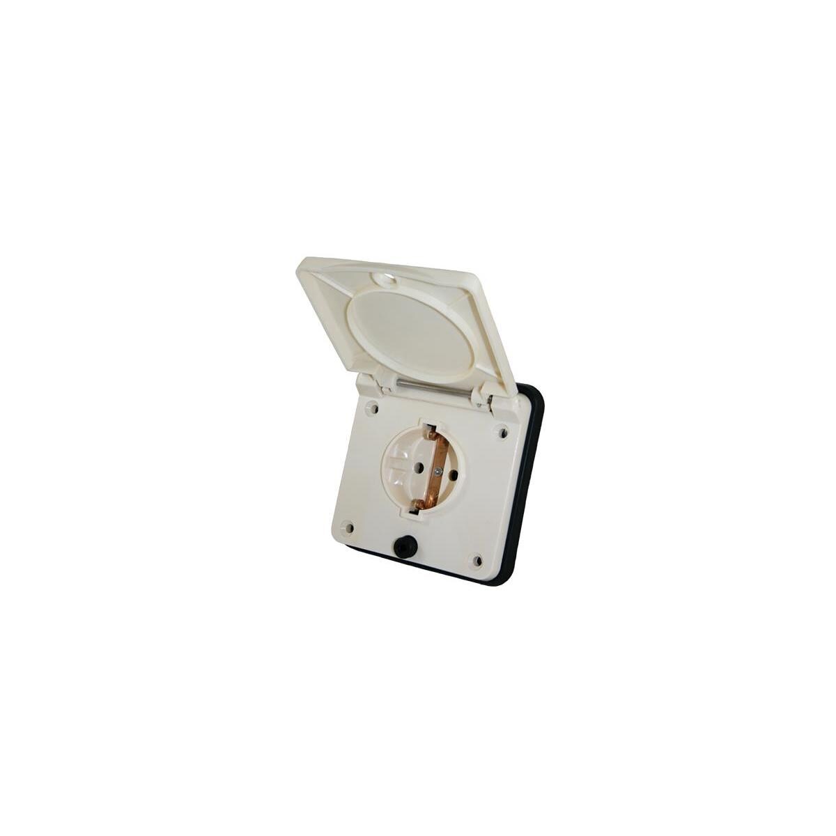 Schuko-Außensteckdose für 230 V-Stromabnahme. Mit Klappdeckel. Wasserdicht durch Gummidichtung. IP 44 Außenmaß:90 x 85 mm Ausschnittmaß:60 mm Ø Einbautiefe:55 mm Farbe: creme