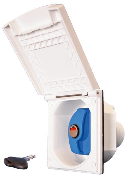 Wassereinfüllstutzen mit Klappdeckel Inklusive Schließzylinder und Schlüssel Wird u. a. bei Chausson, Caravelair, Challenger, Sterckeman, Dethleffs, LMC und TEC in Serie eingesetzt. Technische Daten: Einbaumaß: 135 x 70 mm Einbautiefe: 68 mm