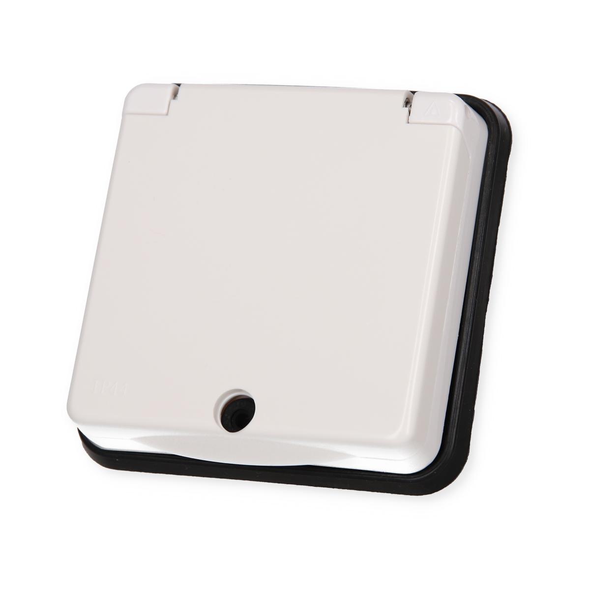 230 V Schuko-Steckdose mit wasserdichter Gummikappe Stecker mit Klappdeckel ohne Sicherungsaufnahme Maße: 88 x 67 x 88 mm Farbe: weiß