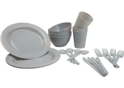 Formschönes und modernes Campinggeschirr. 24-teilig mit Teller, Schalen, Becher und Besteck. Aus robustem, spülmaschinengeeignetem Polypropylen. spülmaschinengeeignet Technische Daten: Gewicht: 400 g Material: 100% Polypropyen Farbe: grau Lieferumfang: 4 Teller 4 Schalen 4 Becher 4 Messer 4 Gabel 4 Löffel