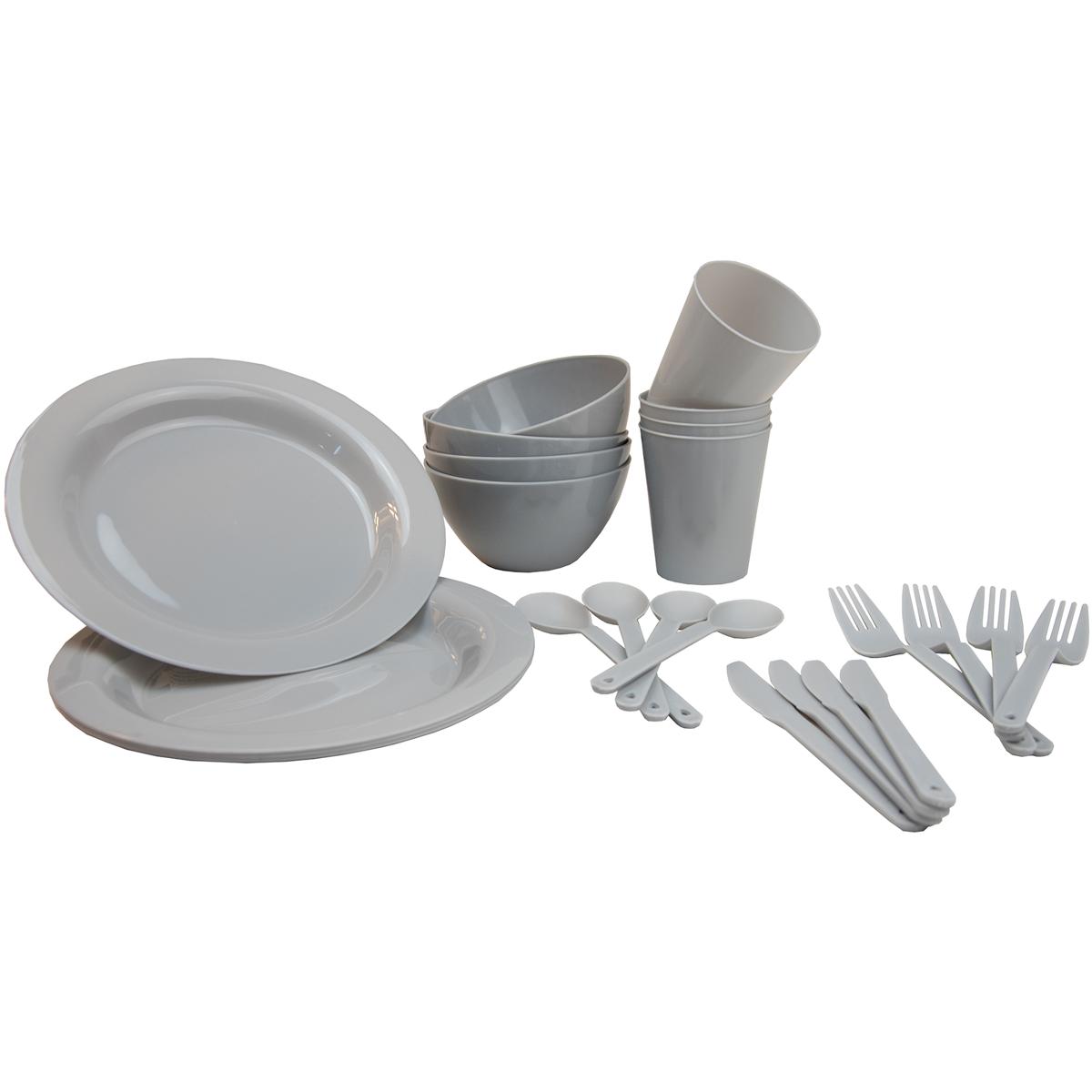 Formschönes und modernes Campinggeschirr. 24-teilig mit Teller, Schalen, Becher und Besteck. Aus robustem, spülmaschinengeeignetem Polypropylen. spülmaschinengeeignet Technische Daten: Gewicht: 400 g Material: 100% Polypropyen Farbe: grau Lieferumfang: 4 Teller 4 Schalen 4 Becher 4 Messer 4 Gabel 4 Löffel