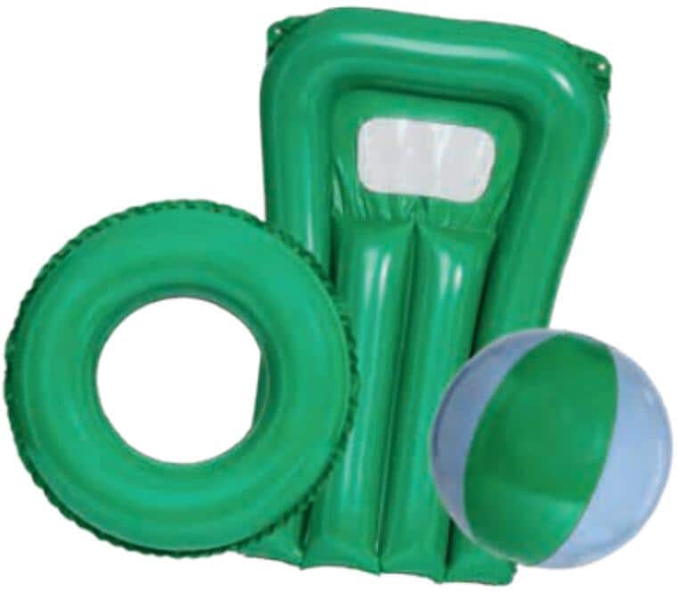 Set bestehend aus 1 Strandball, 1 Schwimmring und 1 Kindermatratze mit Sichtfenster. Aus bis zu 100 % Recyclingmaterial. Technische Daten: Maße Matratze: 67 x 43 cm Maße Schwimmring: ø 45 cm Maße Ball: ø 29 cm Lieferumfang: 1 Strandball 1 Schwimmring 1 Kindermatratze