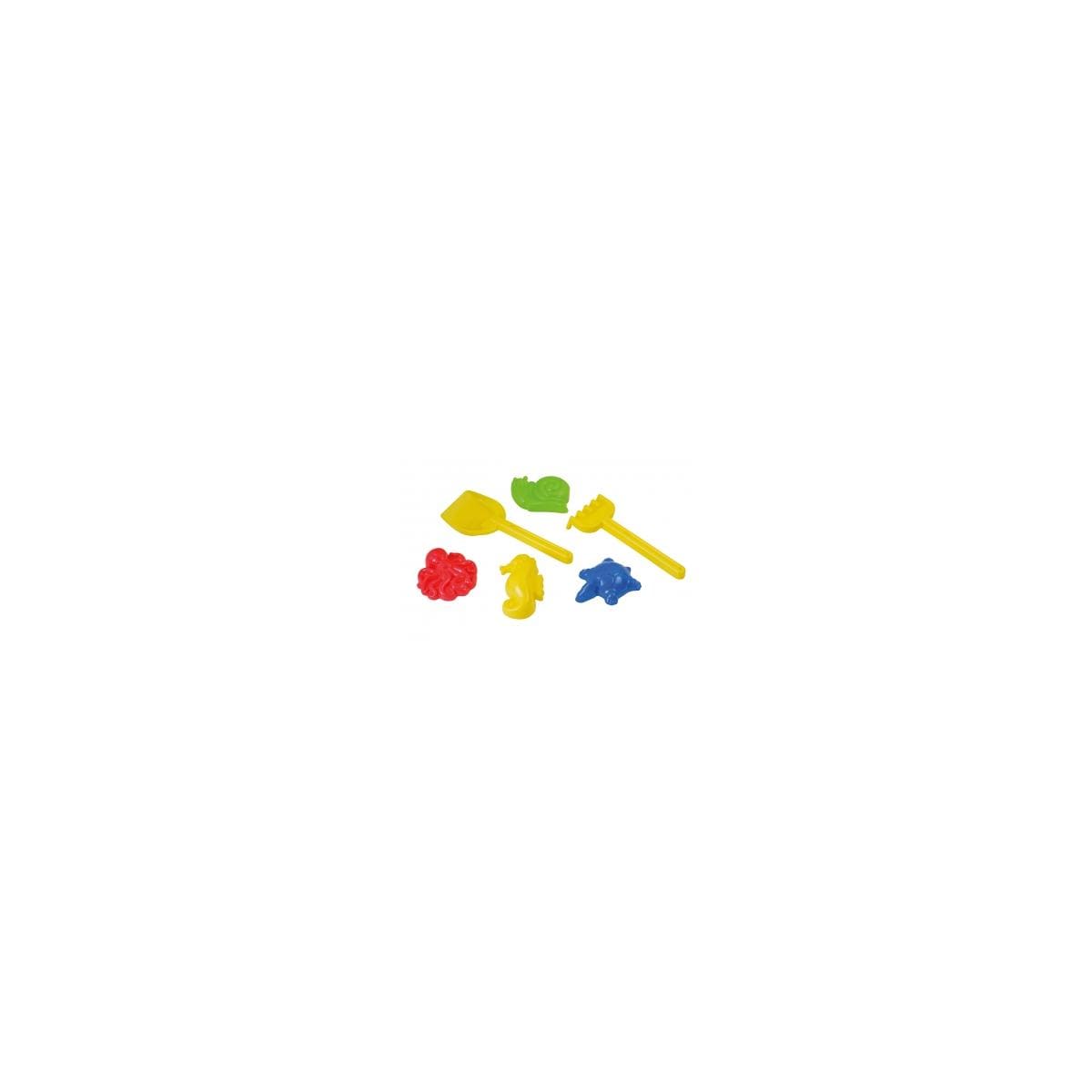 Sandspiel-Set. 6-teiliges Set bestehend aus einer Schaufel, einer Harke und vier Sandformen. Technische Daten: Material Kunststoff Maße: ca. 23,5 x 9 x 8 cm Lieferumfang: 6 teiliges Sandspiel-Set (1 Schaufel, 1 Harke, 4 Sandformen)