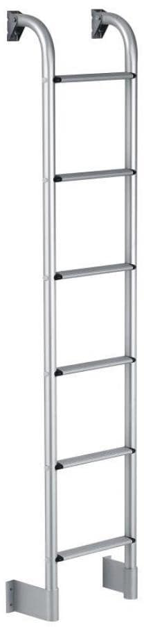 Hergestellt aus rostfreiem Aluminium mit einem Rohr-ø von 30 mm. Die Leiterverfügtüber einen rutschfest-geriffelten Auftritt und ist leicht zu montieren. Heckleiter mit 6 Sprossen Trittbreite 24 cm Länge 145 cm Breite 30,5 cm Abstand vom Heck des Fahrzeugs 14,5 cm Nettogewicht: 4,5 kg Lieferumfang: 1 x Leiter inklusive Montagezubehör