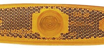 Technische Daten: Waagerechter oder senkrechter Einbau. Lichtscheibe gelb. Mit 12 V-Glühlampe. Grundplatte aus weißem Kunststoff (zum Kaschieren von welligen Außenwänden z. B. Caravan). Maße: 126 x 38 mm.