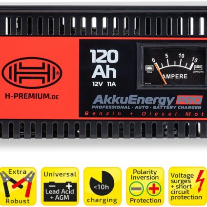Das Heyner AkkuEnergy PRO 11A ist ein leistungsstarkes Batterieladegerät, ideal für 12-Volt-Bleisäure- und AGM-Batterien mit einer Kapazität von 18 bis 120 Ah.Technische Daten:Abmessungen: 100 x 170 x 230 mmGewicht: 4,05 kgBatterietyp: AGM, BleisäureBatterieleistung: 12 VKabellänge: 2 mKapazität in Ah: 18–120 AhLeistungsaufnahme: 130 WStromspannung: 12 VStromstärke: 11 ATasche: (keine Angaben, falls leer)Typ: 120 Ah / 12 Volt / 11 AmpereVerpackungseinheit: StückLieferumfang:1 Batterie-Ladegerät1 Kabel…