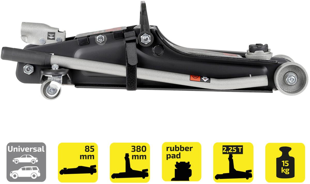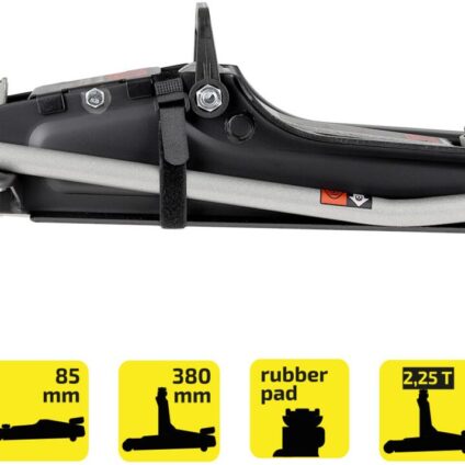 Der HEYNER Flach Rangierwagenheber ermöglicht durch seine geringe Bauhöhe und robuste Hydraulik ein einfaches und sicheres Anheben von Fahrzeugen.Extra flache EinstiegshubhöheKapazität 2,25 tBesonders robuste Qualität, leichte HandhabungLeichtes Rangieren mit zwei SchwenkrädernAuflagenteller mit Gummiauflage (Ø 45 mm)Hubhöhe: 85 – 380 mm, Gewicht: nur ca. 15 kgTechnische DatenAbmessungen: 150x175x560Gewicht: 14.2 kgAntrieb: GriffAuflage: GummiHubbereich: 295 mmHubhöhe max.: 380 mmHubhöhe min.: 85…