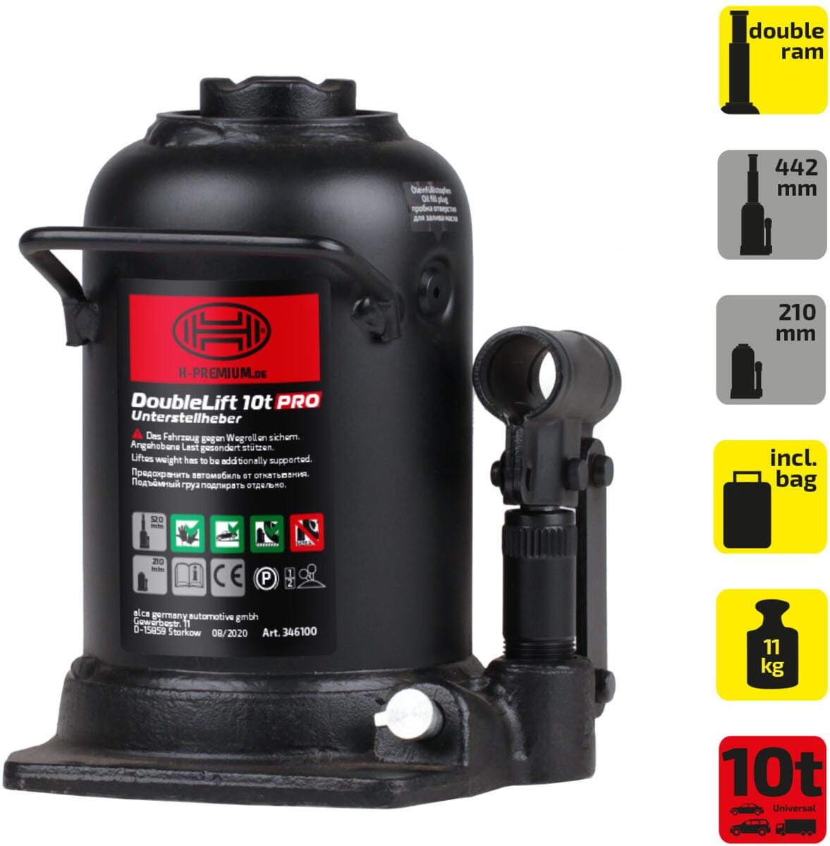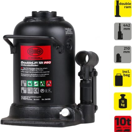 Der Heyner DoubleLift 10t PRO ist ein hochwertiger, 3-stufiger hydraulischer Unterstellheber mit einer Traglast von 10 Tonnen, ideal für schwere Fahrzeuge und anspruchsvolle Hebearbeiten.Technische Daten:Abmessungen: 208 x 161 x 165 mmGewicht: 11,82 kgAntrieb: GriffAuflage: StahlHubbereich: 232 mmHubhöhe maximal: 442 mmHubhöhe minimal: 210 mmMechanismus: hydraulischÖl nachfüllbar: JaTasche: JaTraglast: 10 TonnenTyp: 10 t (3-stufig)Verpackungseinheit: StückLieferumfang1 Wagenheber1 Hebel1 Tasche
