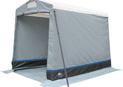 Gerätezelt mit herausnehmbaren Boden, Faulstreifen und Hochentlüftung. Für Garten und Campingplatz. Innenliegendes Gestänge Hochentlüftung PE Faulstreifen Herausnehmbarer PE Boden Technische Daten: Abmessungen (LxB): 230 x 160 cm Stehhöhe: 190 cm Material: Außenzelt: 300D PVC – 150 D Hypertex Poylester PU, 3.000 / 1.000 mm Gestänge: Stahlgestänge 22 mm / 19 mm Gewicht: 13,5 kg Farbe: hellgrau-dunkelgrau-blau Lieferumfang: Zelt, Sturmabspannung, Tragetasche