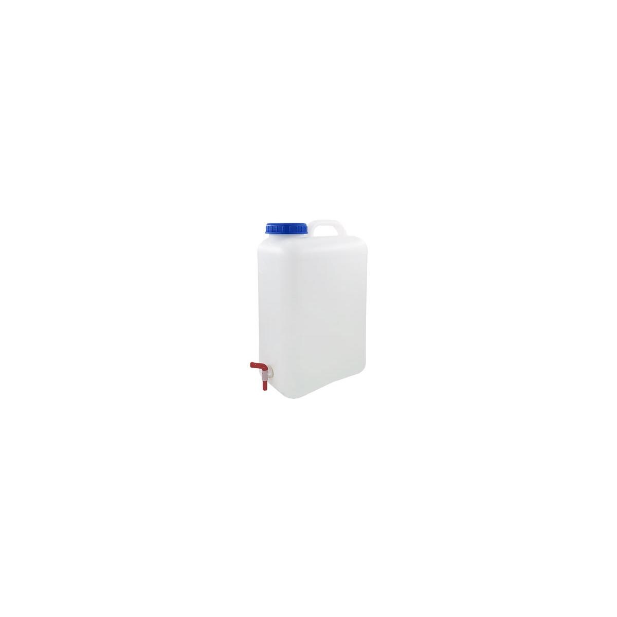 Wasserkanister extra große Öffnung DIN 96 (80 mm) für leichte Innenreinigung per Hand lebensmittelecht mit regulierbarem Wasserhahn BPA frei Technische Daten Material: Polyethylene Volumen: 19 Liter Maße: 47 x 28 x 17 cm Farbe: transparent
