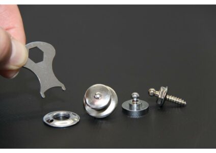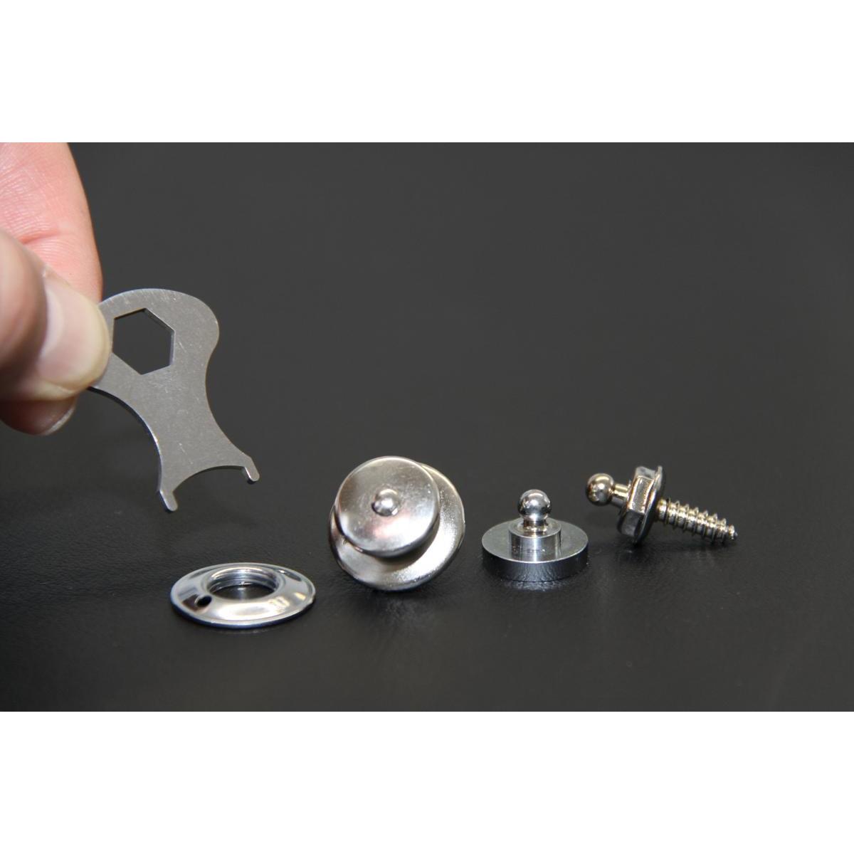 LOXX Sicherheitsdruckknöpfe by Hindermann. Der clevere Security Druckknopf mit auslösender Selbstsicherung für fast alle Anwendungen und extreme Belastungen. Technische Daten: Material: Messing Farbe: silber Lieferumfang: 2 Stk. inkl. Montageschlüssel und Platte Montage: In das zu befestigende Teil entsprechend den Erfordernissen die Positiondes Druckknopfes festlegen und mit einem Locheisen das Materialausstanzen. Entsprechend den Druckknöpfen auf dem Unterteil die genaue Positiondes Kugelteils…