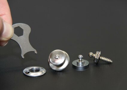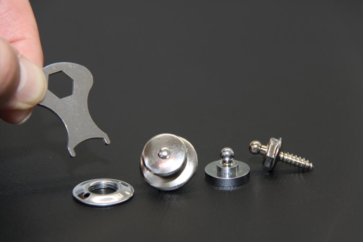 LOXX Sicherheitsdruckknöpfe by Hindermann. Der clevere Security Druckknopf mit auslösender Selbstsicherung für fast alle Anwendungen und extreme Belastungen. Technische Daten: Material: Messing Farbe: silber Lieferumfang: 5 Stk. inkl. Montageschlüssel und Platte Montage: In das zu befestigende Teil entsprechend den Erfordernissen die Positiondes Druckknopfes festlegen und mit einem Locheisen das Materialausstanzen. Entsprechend den Druckknöpfen auf dem Unterteil die genaue Positiondes Kugelteils…