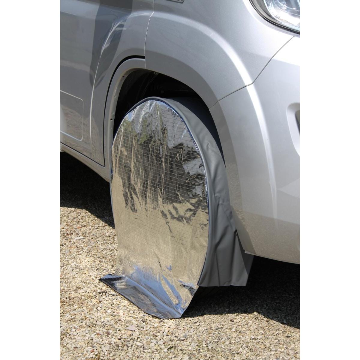 Für Caravans. Die Hülle verfügt über eine reflektierende Frontfläche damit die den Reifen schädigenden UV-Strahlen abgehalten werden, die Hitzeeinwirkung geringer ist und die Reifen nicht leiden. Somit altern die Fahrzeugreifen langsamer. Gute Passform durch dreidimensionale Verarbeitung. Die Hülle liegt auf der Lauffläche auf und kann nicht herunterrutschen. Eingearbeitete Ösen für Erdnägel dienen der sicheren Befestigung. Technische Daten: Fahrzeuge: Wohnwagen Achsen: Einachser Größe: 14, 635/185mm…