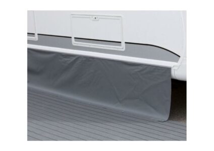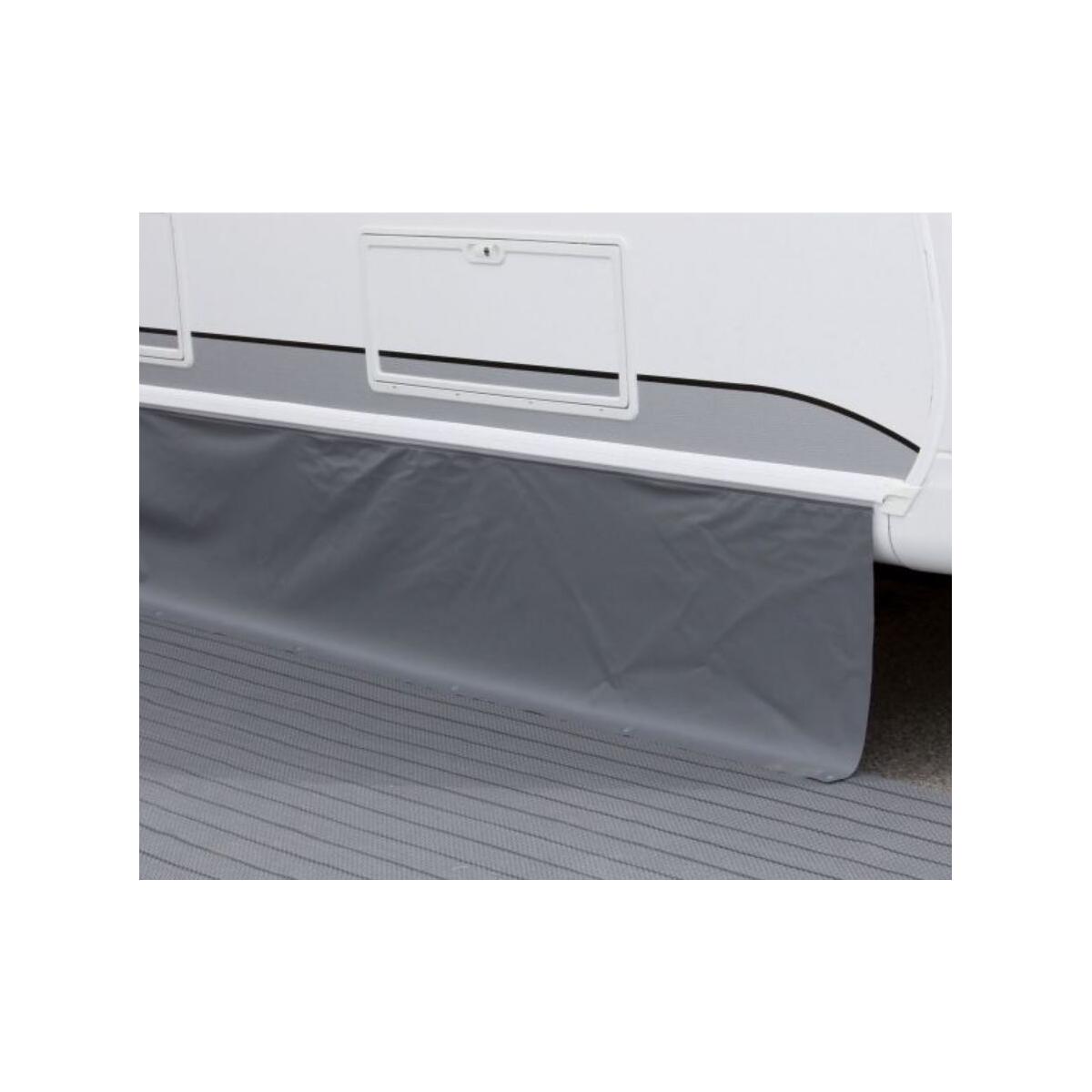 Die Hindermann Bodenschürze bietet mehr Wohnqualität im Vorzelt. Sie dient gleichzeitig als Windschutz und Sichtblende vor dem Caravan. Die hoch belastbaren, eingeschweißten und nicht rostenden PVC- Ösen gewähren eine dauerhafte Befestigung. nicht rostende PVC-Ösen (Abstand 50cm) zum Abspannen am Boden Vinylfolie mit Leinenstruktur angeschweißter 7 mm starker PVC-Keder (kürzbar) Technische Daten Material: 100 % Polyester Farbe: dunkelgrau Länge: 600 cm Höhe: 50 cm Gewicht: 350 g/m2