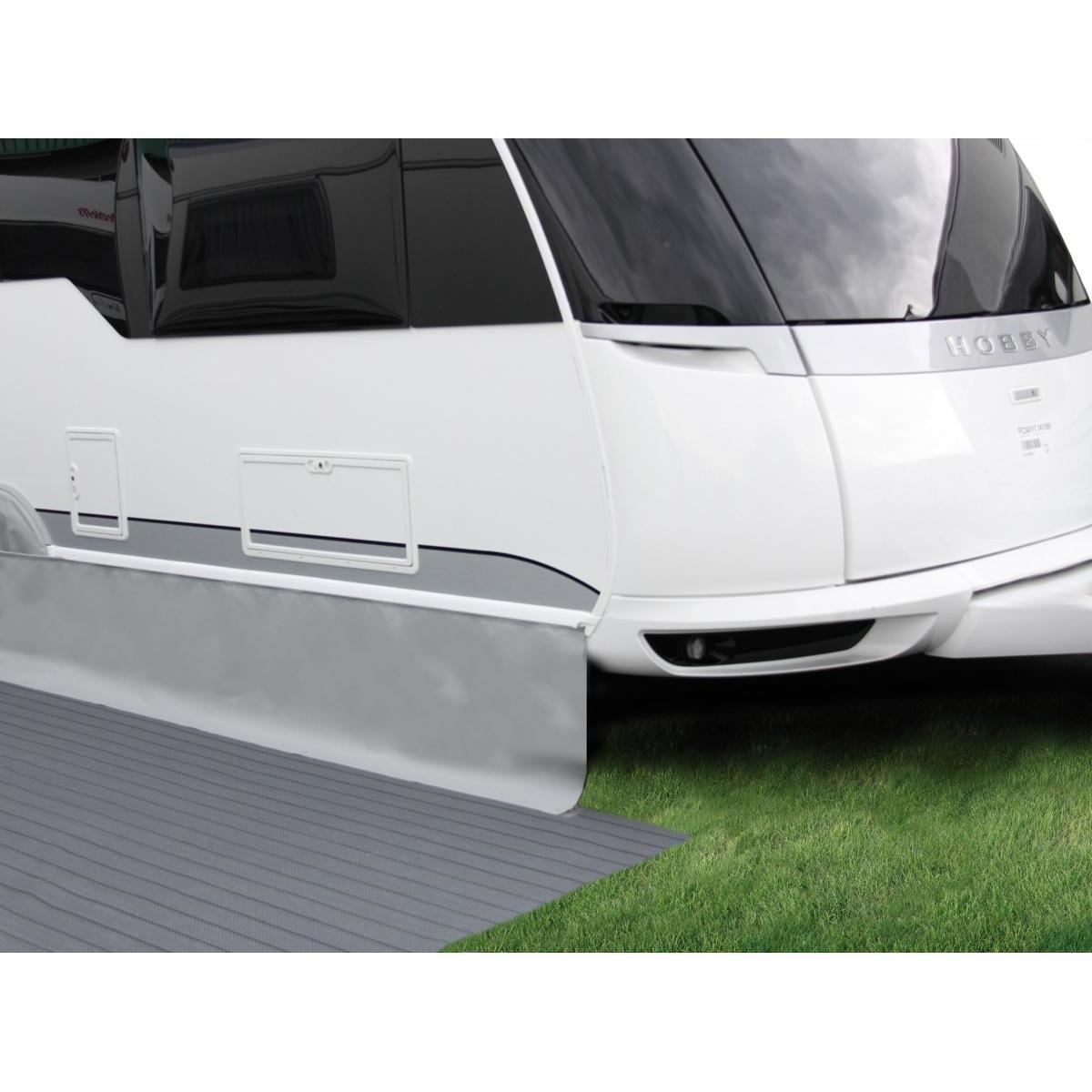 Wind- und Sichtblende am Caravan. Mit hoch belastbaren, eingeschweißten und nicht rostenden PVC-Ösen. Gefertigt aus Weichfolie mit Leinenstruktur mit PVC-Keder. Technische Daten: Material: 100 % Polyester Farben: Hellgrau Höhen: 75 cm Länge 400 cm