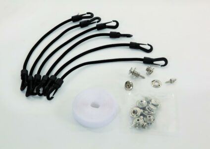 Für die Befestigung der Thermofenstermatte Hindermann LUX für integrierte Reisemobile. Bestehend aus: 5 Stück LOXX-Druckknöpfe 8 Stück Gummispanner 230 cm Flauschband