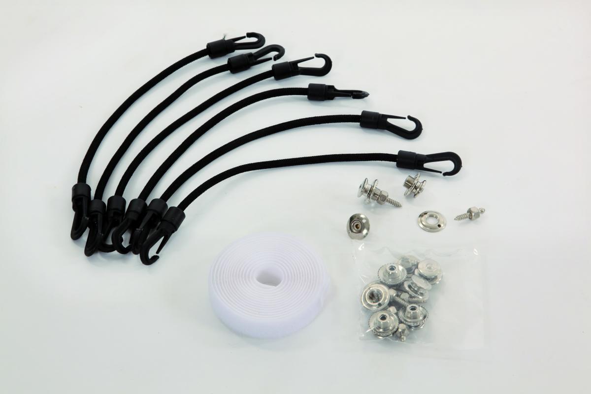 Für die Befestigung der Thermofenstermatte Hindermann LUX für integrierte Reisemobile. Bestehend aus: 5 Stück LOXX-Druckknöpfe 8 Stück Gummispanner 230 cm Flauschband