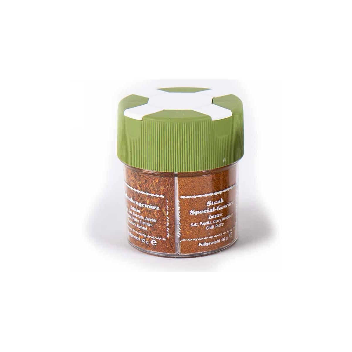 Kompakt und handlich – der ',4 in 1', Grillgewürz Streuer Inhalt: Barbecue Steakgewürz Hähnchengewürz Steak-Spezialgewürz Hinweis: Nicht wiederbefüllbar!