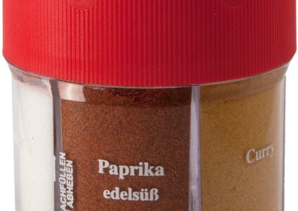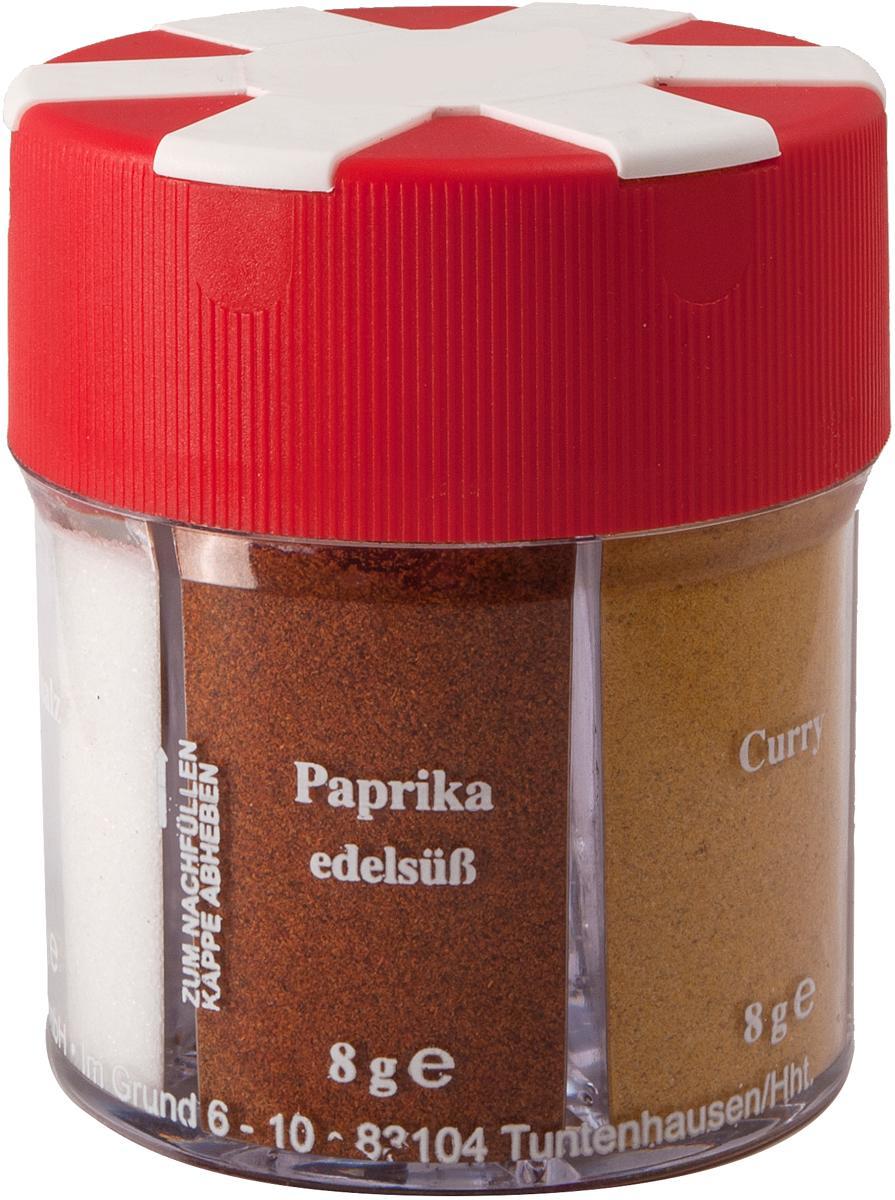 Der Klassiker unter den Gewürzstreuern – &#39,6 in 1&#39,. Alles, was der Gourmet bei Camping, Freizeit, Grillfest oder Reisen zum richtigen Würzen benötigt. Inhalt: Salz (35 g) weißer Pfeffer (7 g) schwarzer Pfeffer (6 g) süßer Paprika (8 g) Curry (8 g) Knoblauch Granulat (8 g) Hinweis: Nicht nachfüllbar!