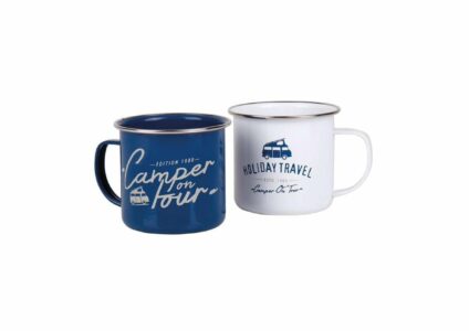 2 Emaille-Becher aus der HOLIDAY TRAVEL Serie in den Farben blau mit CAMPER ON TOUR-Druck und weiß mit HOLIDAY TRAVEL-Druck (jeweils beidseitig bedruckt). Beidseitig bedruckt Technische Daten: Volumen: je 400 ml Farbe: weiß und blau