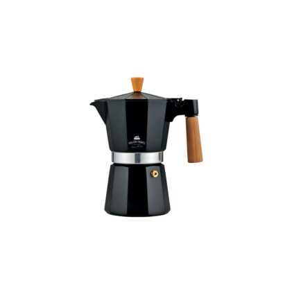Espressokocher aus Aluminium mit Holzknauf. Für die Zubereitung von 6 Tassen. Technische Daten: Gewicht: 700 g Volumen: 300 ml Maße: 17 x 9,5 x 19 cm Material: Aluminium / Holz Farbe: schwarz