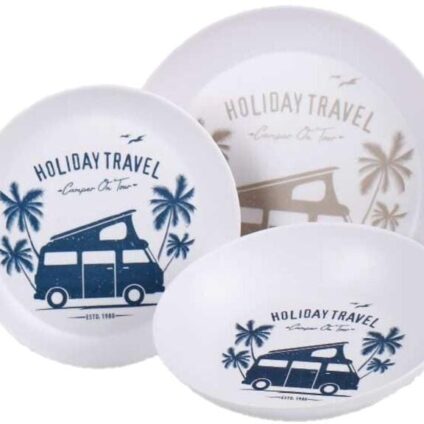 Das Melamin Geschirrset ‚Holiday Travel‘ aus der exklusiven ‚Holiday Travel‘-Produktserie punktet mit seiner schweren Premium-Qualität und dem großflächigen Vintage-Druck für alle Bulli-Liebhaber und Camper.perfekt für Bulli-LiebhaberlebensmittelechtTechnische Daten:Material: 100% MelaminGewicht: 1,7 kgLieferumfang:2 Essteller (Ø 25,5 cm)2 Dessertteller (Ø 20 cm)2 Suppenteller Ø 20 cm, Höhe 4 cm)Hinweise:Temperaturbeständig bis max. 70°C für max. 2 StundenNicht geeignet für die…