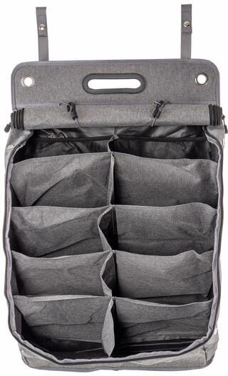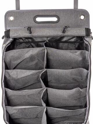 Schuh-Organizer für 12 Paar Schuhe mit Ösen und Riemen für Befestigung.praktisch und leichtTechnische Daten:Breite: 480 mmHöhe: 860 mmMaterial: PolyesterFarbe: grau-meliertLieferumfang:1 Travel Schuh-Organizer