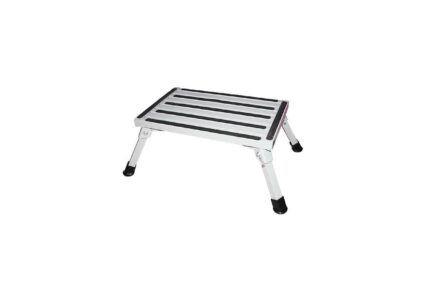 Sehr stabile Trittstufe mit einklappbaren Standbeinen. Robuste Konstruktion aus pulverlackiertem Aluminium. Mit großflächiger, rutschfester Trittfläche. Technische Daten: Belastbar: bis 150 kg Abmessungen (BxTxH): 48 x 30 x 23 cm Gewicht: ca. 2,7 kg