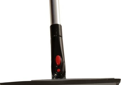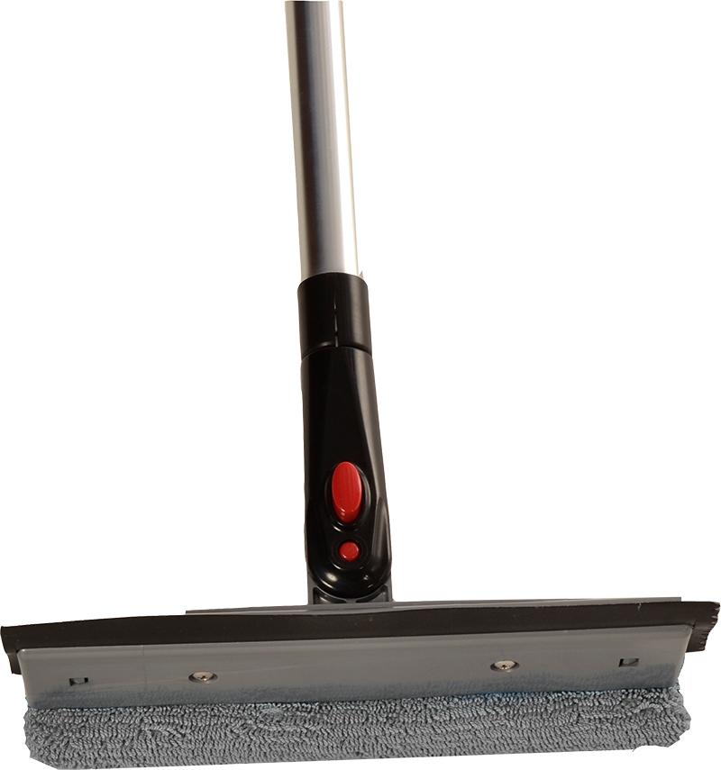Scheibenreiniger mit Schwamm und Kunststoff-Abstreichprofil. Teleskopierbar bis 150 cm. Mit ergonomischen Schaumstoff-Griffen.