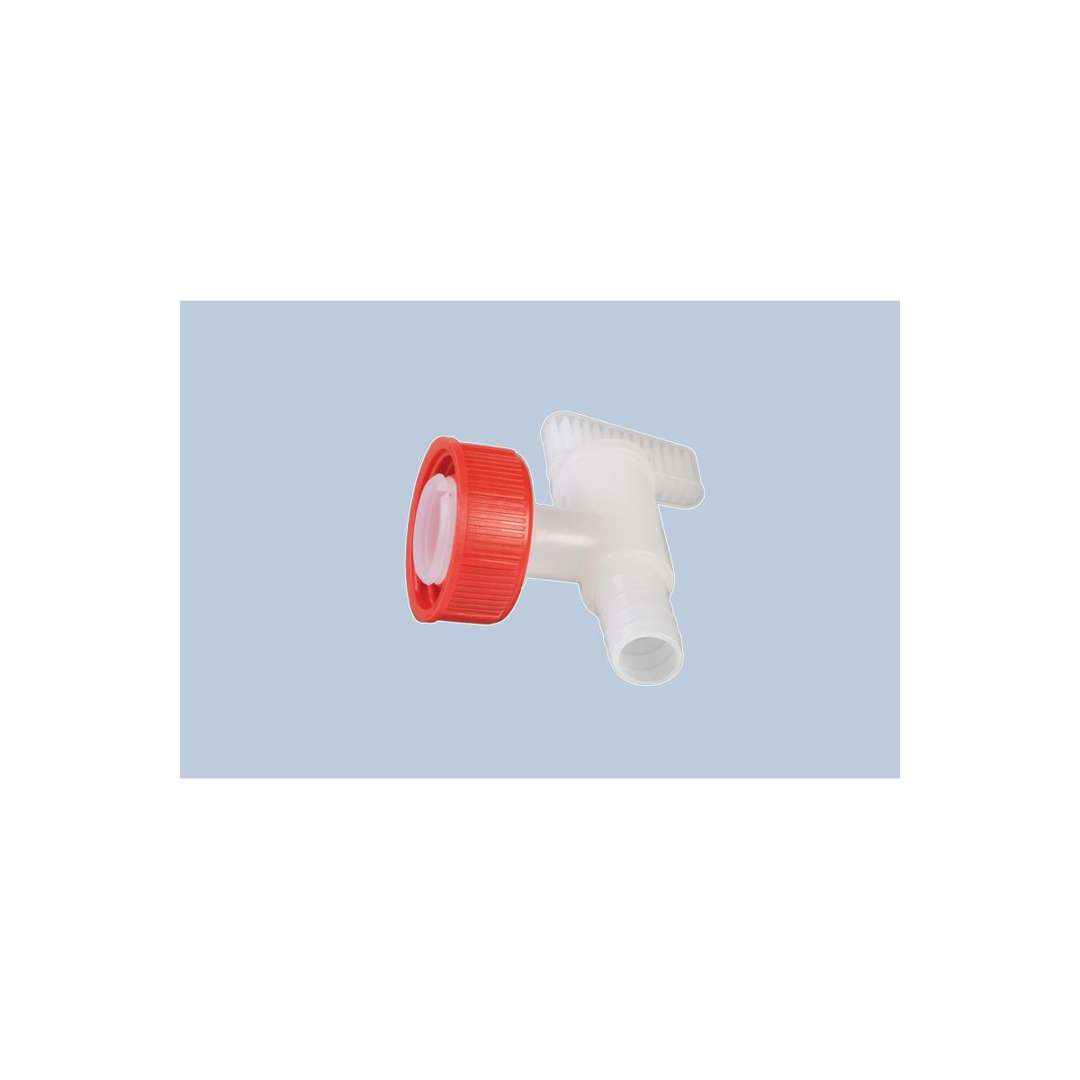 Ablasshähne ECO mit roter DIN 45-Verschraubung zum kontrollierten Ablassen von Flüssigkeiten aus Industrie- und Verpackungskanistern, naturfarben aus bruchsicherem und lebensmittelbeständigem Polyethylen HDPE/LDPE mit Tüllenanschluss für einen Schlauch sehr gute chemische Beständigkeit gegen Säuren, Laugen und weitere Chemikalien mit roter DIN-Verschraubung unbelüftet besonders geeignet für Kanister mit zusätzlicher Belüftungsöffnung Technische Daten: druckbeständig bis max. 0,4 bar (für die Verwendung…