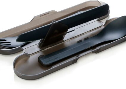 Reisebesteck in neuer Form und Art: die kompakte Transportdose bietet geöffnet Zugriff auf jedes einzelne der Teile und schützt das Set hygienisch. Beinhaltet sind im Trio je eine Gabel mit vernünftigen Spitzen und einer Teil-Kante (für weichere Lebensmittel), ein Löffel mit sehr weichen und mundgerechten Kanten sowie ein Messer mit gewellter Klinge. Dadurch wird eine gute Schneidleistung erreicht, die auch für zarteres Fleisch vollkommen ausreichend ist. Integriert im Messer ist ein Kapselheber. Als…