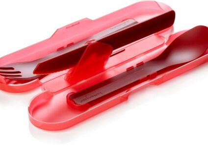 Reisebesteck in neuer Form und Art: die kompakte Transportdose bietet geöffnet Zugriff auf jedes einzelne der Teile und schützt das Set hygienisch. Beinhaltet sind im Trio je eine Gabel mit vernünftigen Spitzen und einer Teil-Kante (für weichere Lebensmittel), ein Löffel mit sehr weichen und mundgerechten Kanten sowie ein Messer mit gewellter Klinge. Dadurch wird eine gute Schneidleistung erreicht, die auch für zarteres Fleisch vollkommen ausreichend ist. Integriert im Messer ist ein Kapselheber. Als…