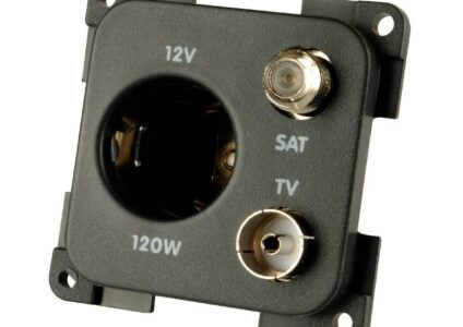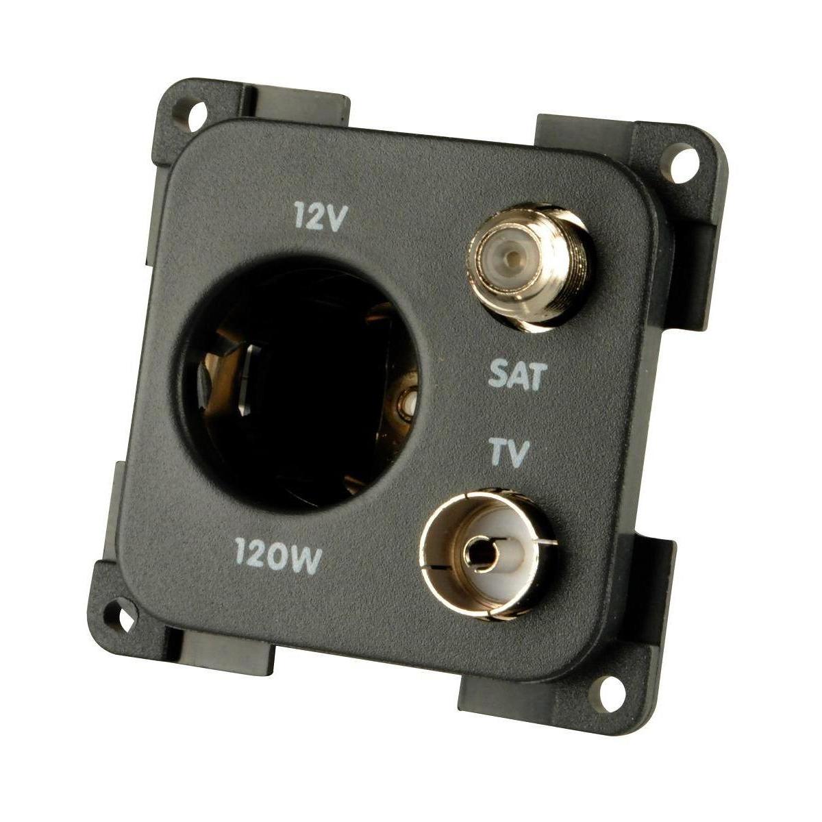 Kombisteckdose mit 12 V Norm-Steckdose, Koaxialsteckdose und F-Stecker Anschluss für System 10.000 Alles optimal aufeinander abgestimmt Einfache und sichere Montage mit Zentrierhilfe für exakte Positionierung und Montage zum Innenausbau für Wohnwagen, Schiffe und Boote Technische Daten: Farbe: Schiefergrau Maße (B x T x H): 6 × 4 × 6 cm Gewicht: 49 g Schraubanschluss Lieferumfang: 1 Stück Notwendiges Zubehör: Berührungsschutzdose