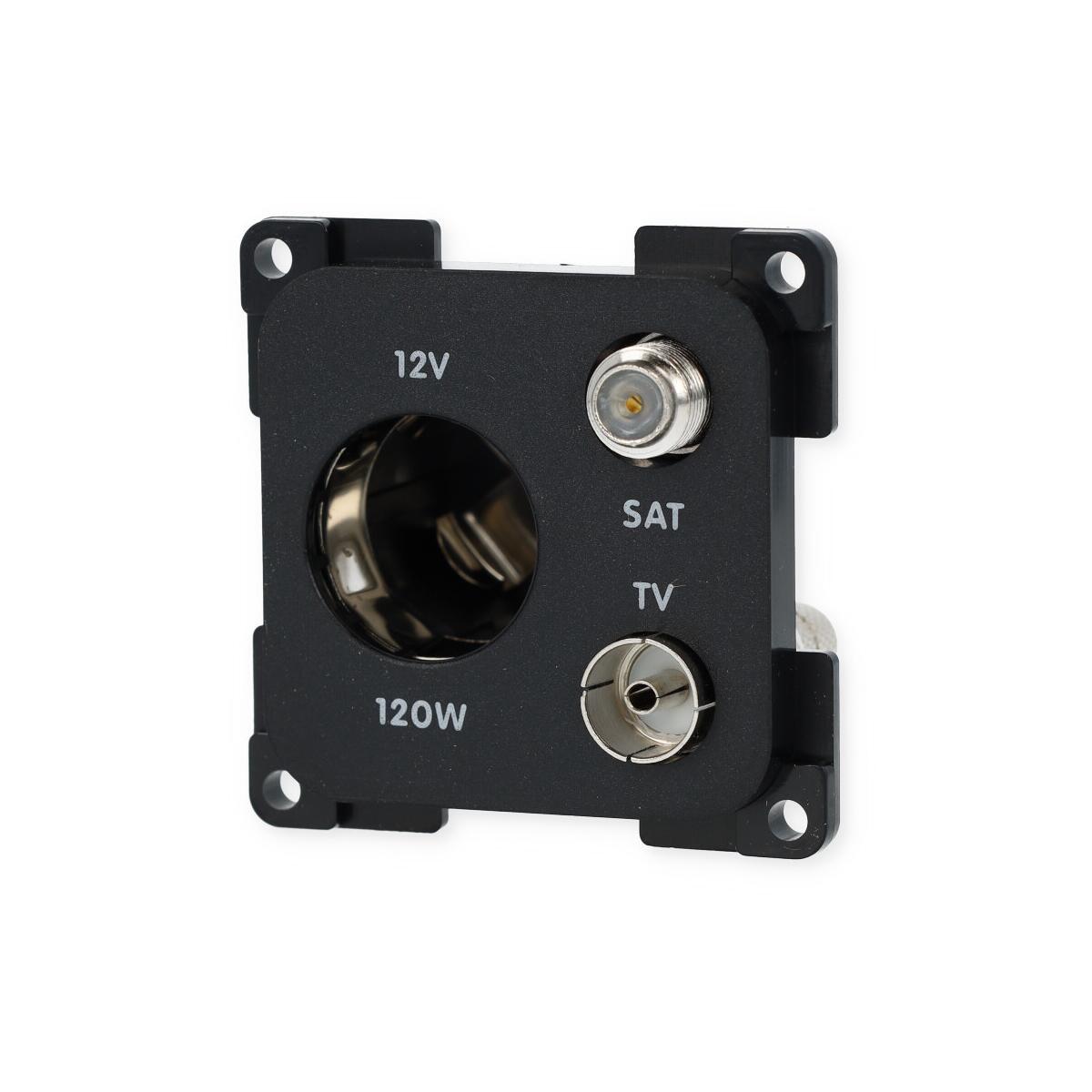 Kombisteckdose mit 12 V Norm-Steckdose, Koaxialsteckdose und F-Stecker Anschluss für System 10.000 Alles optimal aufeinander abgestimmt Einfache und sichere Montage mit Zentrierhilfe für exakte Positionierung und Montage zum Innenausbau für Wohnwagen, Schiffe und Boote Technische Daten: Farbe: schwarz Maße (B x T x H): 6 × 4 × 6 cm Gewicht: 49 g Schraubanschluss Lieferumfang: 1 Stück Notwendiges Zubehör: Berührungsschutzdose