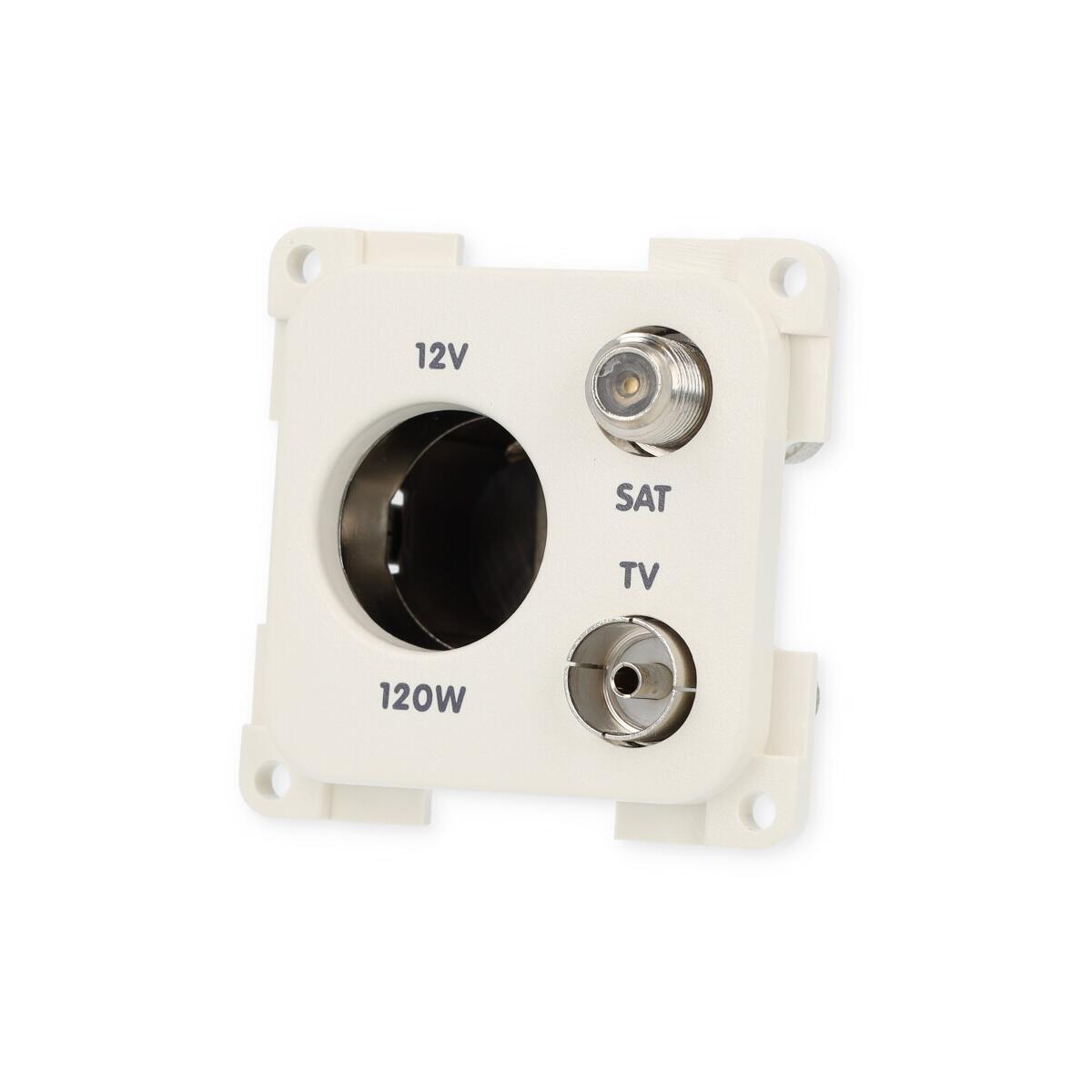Kombisteckdose mit 12 V Norm-Steckdose, Koaxialsteckdose und F-Stecker Anschluss für System 10.000 Alles optimal aufeinander abgestimmt Einfache und sichere Montage mit Zentrierhilfe für exakte Positionierung und Montage zum Innenausbau für Wohnwagen, Schiffe und Boote Technische Daten: Farbe: weiß Maße (B x T x H): 6 × 4 × 6 cm Gewicht: 49 g Schraubanschluss Lieferumfang: 1 Stück Notwendiges Zubehör: Berührungsschutzdose