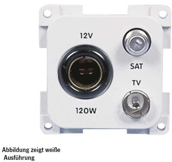 Kombisteckdose mit mit 12 V-Ziagerettenanzünder Steckdose, TV-Steckdose und SAT-Steckdose (Schraubanschluss) für System 10.000 Alles optimal aufeinander abgestimmt Einfache und sichere Montage mit Zentrierhilfe für exakte Positionierung und Montage zum Innenausbau für Wohnwagen, Schiffe und Boote Technische Daten: Farbe: Grau Maße (B x T x H): 6 × 4 × 6 cm Gewicht: 49 g Schraubanschluss Lieferumfang: 1 Stück Notwendiges Zubehör: Berührungsschutzdose