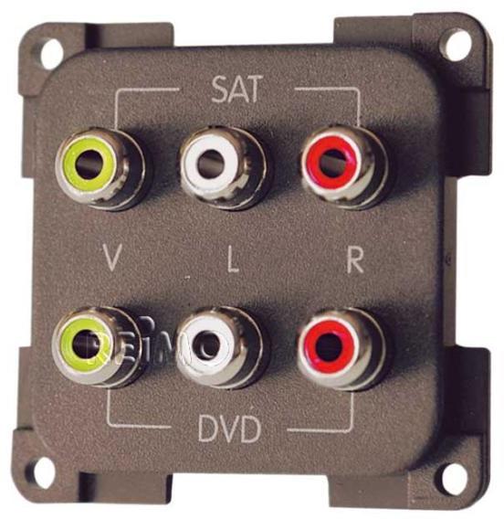 Kombisteckdose mit Anschluss für Chinch AV & Audiomodul für System 10.000 Alles optimal aufeinander abgestimmt Einfache und sichere Montage mit Zentrierhilfe für exakte Positionierung und Montage zum Innenausbau für Wohnwagen, Schiffe und Boote Technische Daten: Farbe: Braun Maße: 52,9 × 52,9 6 Chinch-Anschlüsse für Bild und Tonübertragung z.B. vom Receiver zum DVD/TV Lieferumfang: 1 Stück Notwendiges Zubehör: Abdeckrahmen Berührungsschutzdose