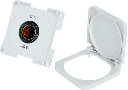 12 V Norm Steckdose mit Klappdeckel System 10.000 vertikaler oder horizontaler Einbau Außenmaße pro Element einschließlich Rahmen lediglich 60 x 60 mm – das Stichmaß liegt bei nur 53 mm Innenausbau für Wohnwagen, Schiffe und Boote Größter Komfort auf kleinstem Raum – in einer Vielfalt, die am Markt nahezu einmalig ist Technische Daten: Farbe: weiß DIN 4165 Einbautiefe: 33 mm 2-polig Nennspannung: 6-24 V / 10 A Flachkontakte 6,3 mm Maße (B x T x H): 52,9 × 52,9 × 40 mm Gewicht: 45 g Lieferumfang: 1 Stück…