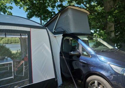 Die Verbindungsschleuse wird per Reißverschluss mit dem Vorzelt verbunden und lässt sich sehr schnell auch wieder lösen, um z.B. einen Tagesausflug mit dem Fahrzeug zu unternehmen. Die Fahrzeugspezifische Schleuse ermöglicht einen sehr guten Abschluss am Fahrzeug. Dachverbindung am Fahrzeug bei: VW…handelsüblicher Keder oder an einer Markise (Thule, Fiamma, Dometic), Family Van: Crosscamp mit Spezialkeder ansonsten an handelsüblichen Keder oder an einer Markise (Thule, Fiamma, Dometic), Van: an einer…