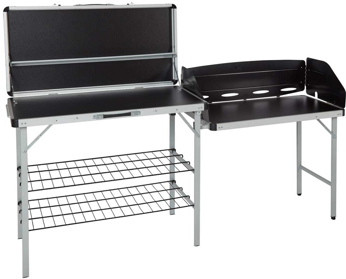Die faltbare Outdoorküche besteht aus 2 Teilen: der Hauptteil mit einer großzügigen Arbeitsfläche, integriertem Gewürzregal und 2 Fächern für Küchenutensilien bietet genügend Platz zur Vorbereitung Ihrer Gerichte. Der zweite Teil ist etwas tiefer und speziell für den Einsatz von Campingkochern geeignet, hier macht sich der Windschutz der Küche besonders gut. Alle Oberflächen sind sehr reinigungsfreundlich und die verarbeiteten Materialien sehr robust und wetterbeständig. Die Outdoorküche lässt sich ganz…