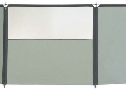3-teiliger Windschutz mit Aufstell- und Querstangen sowie spezieller Bodenverankerung kann mittels Reißverschluss unendlich erweitert werden aus leichtem, beschichtetem Polyester Rechts und links mit Bullauge Mittelteil mit Fenster in der oberen Hälfte Technische Daten: Größe (BxH): 460 x 140 cm Farbe: grau Gestänge:Stahl Gewicht: 8,5 kg Lieferumfang: Gestänge, Erddorn, Abspannleinen, Heringe,Bodenhülse, Dreiecksplatte und Aufsteckdorn.