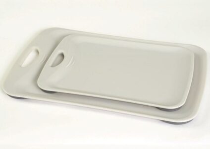 Zwei Schneidbretter mit rutschfester Unterlage und Mulde zum Auffangen von Flüssigkeit. rutschfest spülmaschinengeeignet Technische Daten: Farbe: hellgrau Maße: 37 x 24 cm & 28 x 19 cm Material: Polypropylen