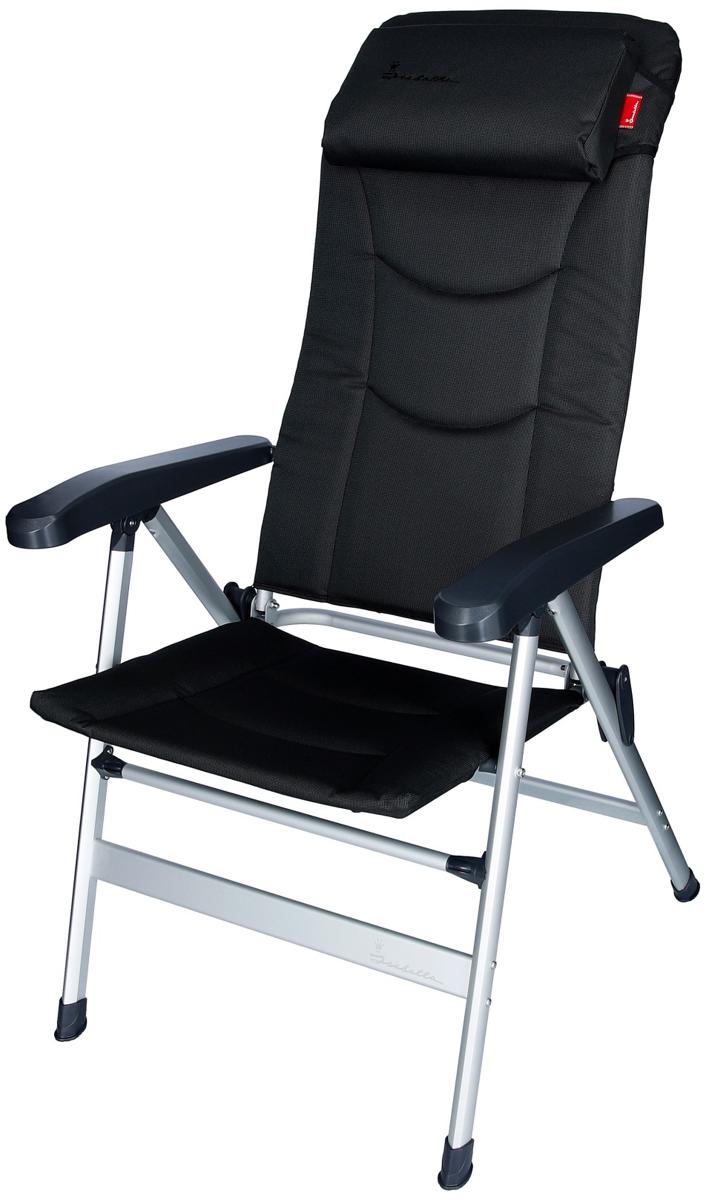 Komfort-Campingstuhl mit 8-fach verstellbarer Rückenlehne und Kopfpolster, welches man in der Höhe verschieben kann. mit Kopfpolster, abnehmbar und höhenverstellbar Polster ist Schmutz- uns Wasserabweisend Stabiles Aluminiumgestell Technische Daten: Ausführung: gepolstert Material: 100 % PES Polyester, Aluminium Belastbar bis: 120 kg Farbe: dunkelgrau Sitzhöhe: 47 cm Maße (B x T x H): 59 × 80 × 120 cm Packmaß: 118 x 63 x 14 cm Gewicht: 5,5 kg