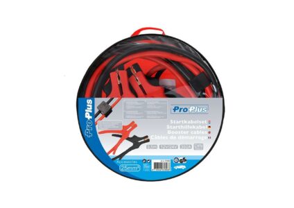 Starthilfekabel 25 mm² mit Überspannungsschutz Zugelassen für Benzinmotoren bis 5.500 ccm und Dieselmotoren bis 3.000 ccm Mit Safety-StartTechnologie, vermeidet Spannungsspitzen und schützt die hochwertige Fahrzeugelektronik TÜV/GS geprüft Gesamtlänge 2 x 3,5 m flexibles Kupferkabel nach ISO 6722 Norm 4 vollisolierte Pol-Zangen max. 350 A.