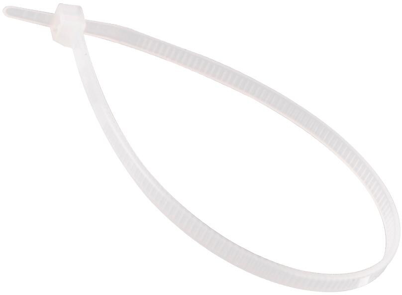 Hochwertige Qualitätsausführung mit hoher Zugfestigkeit, schwer entflammbar, dauerhaft und beständig, UL geprüft, UV-stabilisiert. Beutelverpackung mit Euro-Lochung – ideal für den Ladenverkauf. Technische Daten: Einsatztemperatur: -40 °C, 85 °C Montagetemperatur: -10 °C, 60 °C Material: PA Polyamid Bündeldurchmesser: max. 50 Millimeter Maße (L x B): 200 × 3,6 mm Gewicht: 99 g Farbe: natur Lieferumfang: 100 Stück