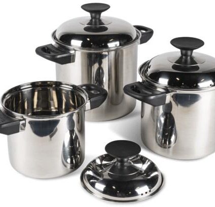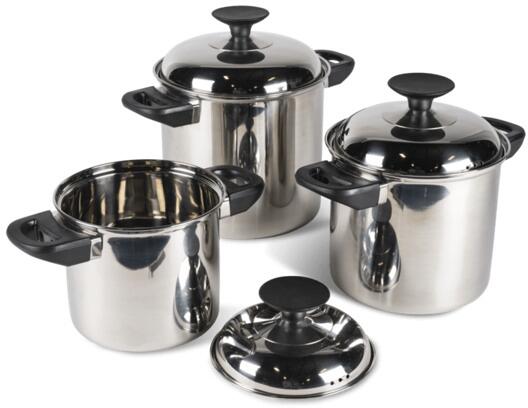 Stapelbares Camping-Kochset. Leicht und dennoch robust – dank der hochwertigen Edelstahlkonstruktion. Das Space Saver Kochset mit drei Töpfen lässt sich stapeln und dadurch platzsparend verstauen. 3 Stahltöpfe Töpfe sind stapelbar für platzsparende Unterbringung hitzebeständige Griffe komplett mit Edelstahldeckel geeignet für Elektrik, Gas, Induktion, Halogen und Keramik Technische Daten: Maße: Topf ø 14cm, Höhe: 13 cm Maße: Topf ø 16 cm, Höhe: 14 cm Maße: Topf ø 18 cm, Höhe: 17 cm Material:…