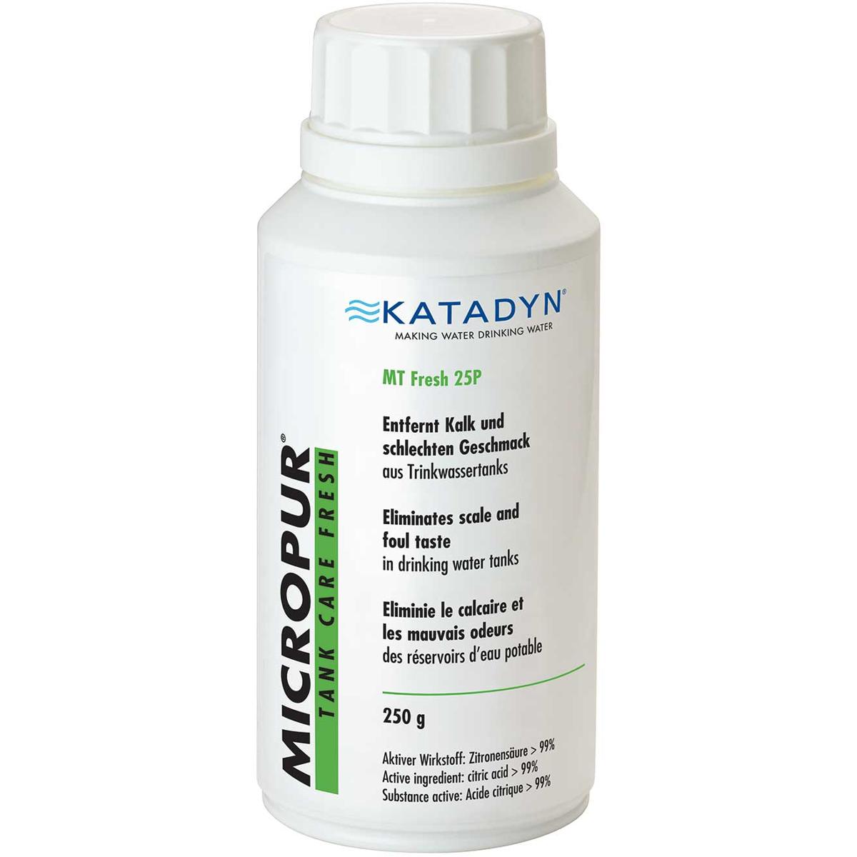 Katadyn Micropur Tank Care Line MT Fresh 25P. Entfernt Kalk und schlechten Geschmack aus Trinkwassertanks. Die Micropur Tankpflege- und Wasseraufbereitungsprodukte sind eine einfache Lösung gegen Probleme, die Bakterien und Algen verursachen. MT Fresh beseitigt mit natürlicher Zitronensäure muffigen Geruch, schlechten Geschmack und Kalk in Wassertanks, Leitungen und Pumpen. Technische Daten: Inhalt:: 250 g Form: Pulver Verwendbar für: 25L