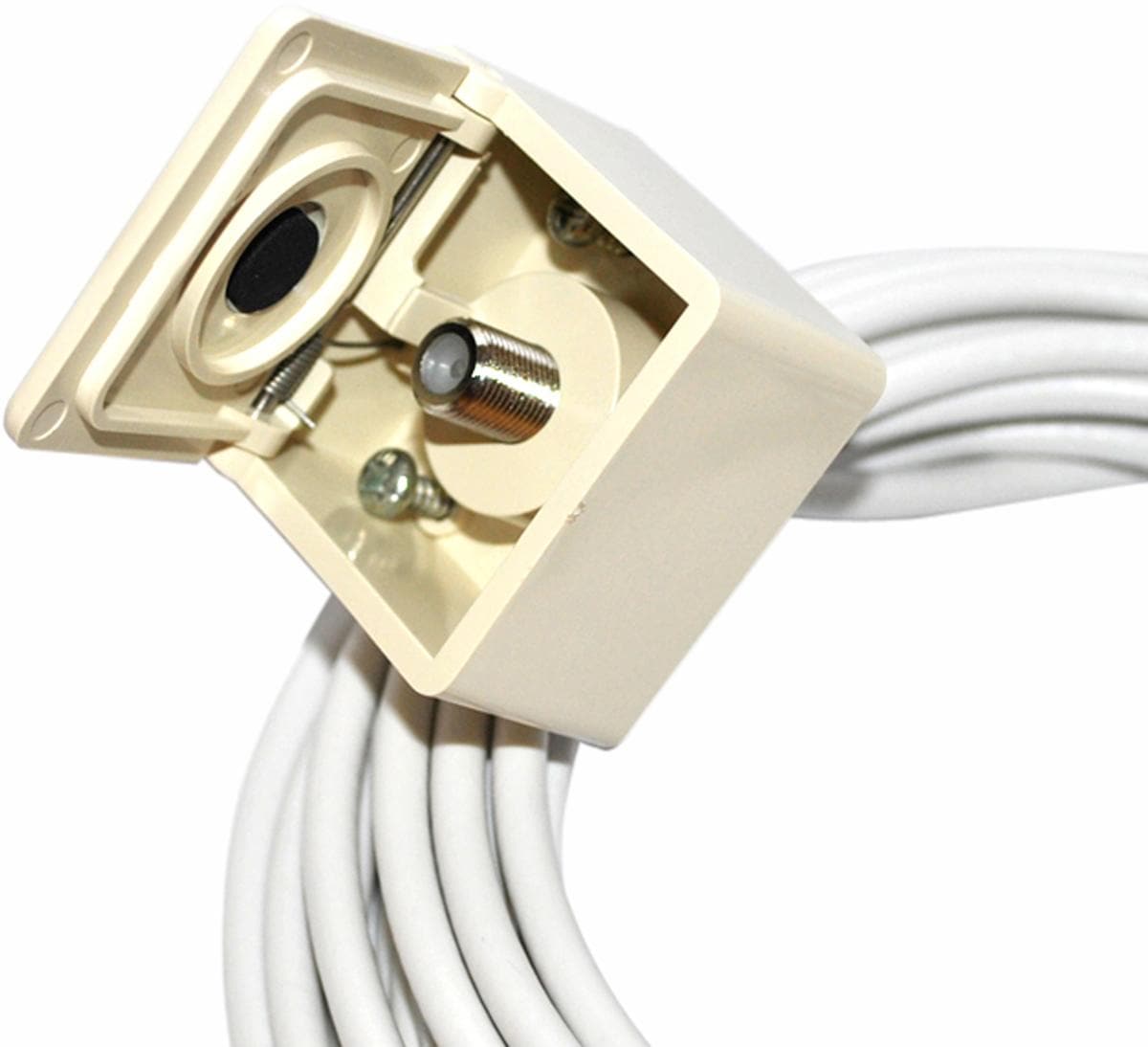 Wassergeschützte Ansteckdose in F-Technik mit 5 m Koaxialkabel und F-Stecker anschraubbar.Zur Außenmontage, mit Klappdeckel. Außen-Steckdose mit 5-m-Koaxialkabel Anschluss: F-Connector Technische Daten: Typ: EV 06 Maße: 44 x 44 x 29 mm Gewicht: 0,24 kg
